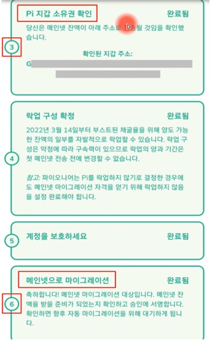 - 그 후에 3번 '파이 지갑 소유권 확인'과 6번 '메인넷 마이그레이션' 항목에다가 새로 생성한 비밀구절 단어를 입력하면 됩니다.