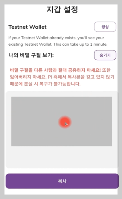 만약 로그인이 된 상태라면, 설정(톱니바퀴) → 나의 비밀 구절 보기 메뉴를 통해 다시 확인할 수 있습니다. 그러나 한 번 로그아웃된 후에는 복구 방법이 없으므로 유의해야 합니다.