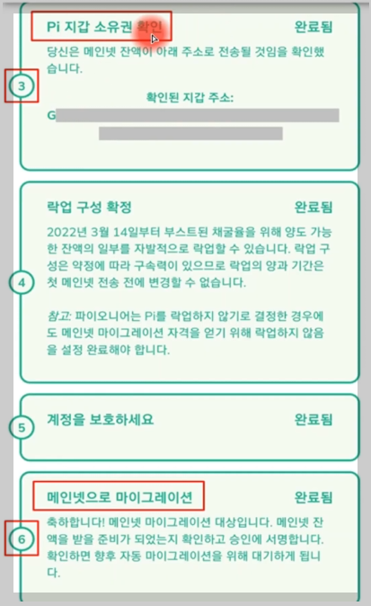- 그 후에 3번 '파이 지갑 소유권 확인'과 6번 '메인넷 마이그레이션' 항목에다가 새로 생성한 비밀구절 단어를 입력하면 됩니다.