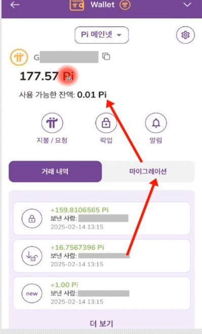 이를 확인하려면 메인넷 체크리스트에서 '파이 지갑 소유권 확인(3번)'과 '메인넷 마이그레이션(6번)'에 입력된 지갑 주소를 확인해야 합니다. 만약 이 두 주소가 다르다면, 마이그레이션된 지갑이 아닌 다른 지갑을 사용하고 있을 가능성이 있습니다. 이 경우 파이 지갑 소유권 확인(3번) 지갑 주소의 비밀 구절 단어를 파이 브라우저의 Wallet으로 들어가셔서 비밀 구절을 입력해서 잠금 해제 하셔야 합니다. 그 후, 다시 지갑에 들어가시면 동일한 지갑 주소가 표시 되면서 파이 채굴 수량이 보이게 됩니다.