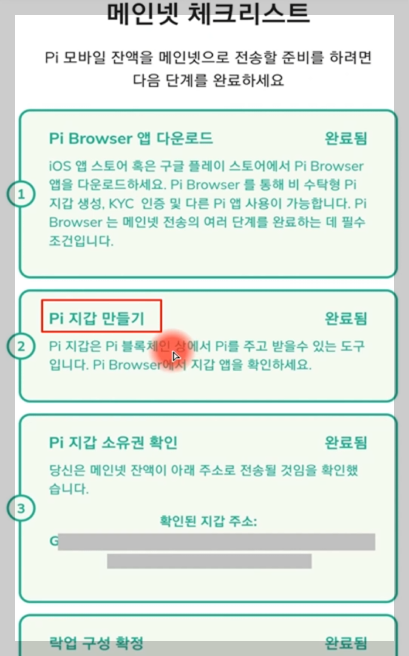 - 메인넷 체크리스트에서 2번이 완료됨이라고 되어 있지만 'Pi 지갑 만들기'를 클릭한 후, 새 지갑을 만들면 됩니다.