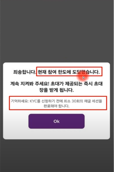 KYC 신청 시 "현재 참여 한도에 도달했습니다"라는 메시지가 뜨는 경우, 채굴앱의 번개 버튼을 눌러 최소 30회의 채굴 세션을 완료해야 합니다. 만약 30회 이상 채굴을 했음에도 같은 오류가 발생한다면 비밀번호 변경 후 재시도하거나, 이메일 변경 후 일정 시간이(하루 정도) 지난 뒤 다시 시도해보면 해결되는 사례가 있습니다.