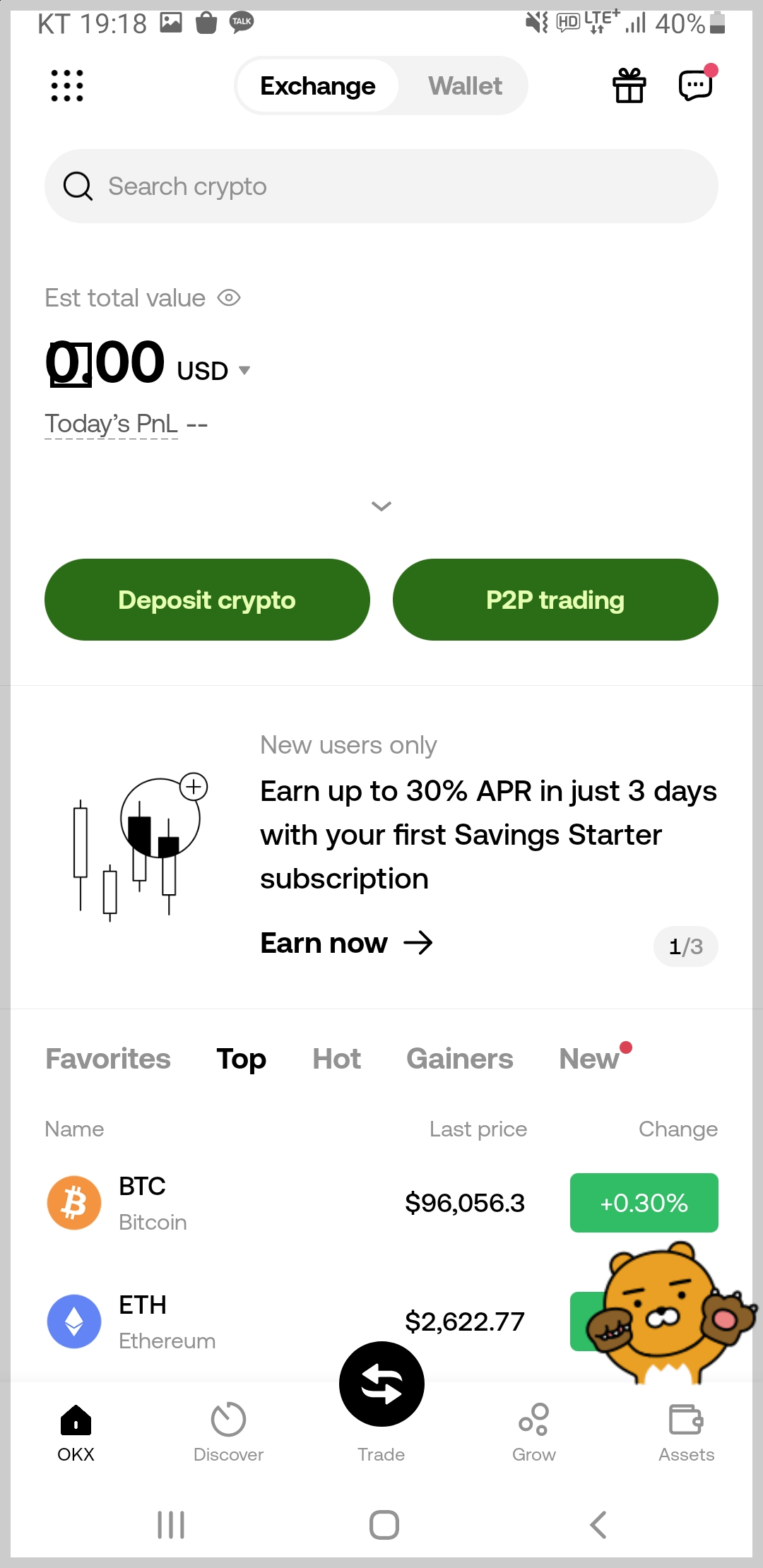 - OKX에 로그인한 후 메인 화면 위쪽의 'Deposit(입금)' 버튼을 클릭하세요.