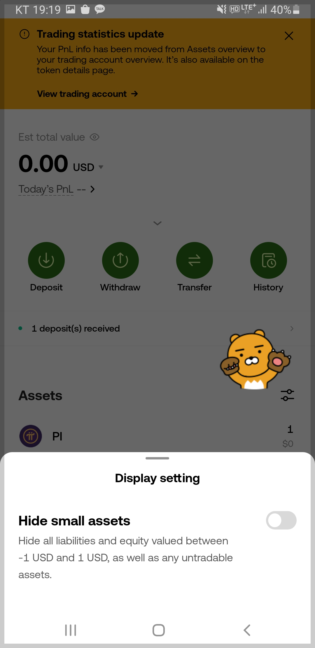 - Pi 코인이 보이지 않을 경우 asset 글자 오른쪽 아이콘을 클릭하며 1달러 미만 코인 보기/끄기를 할 수 있는데