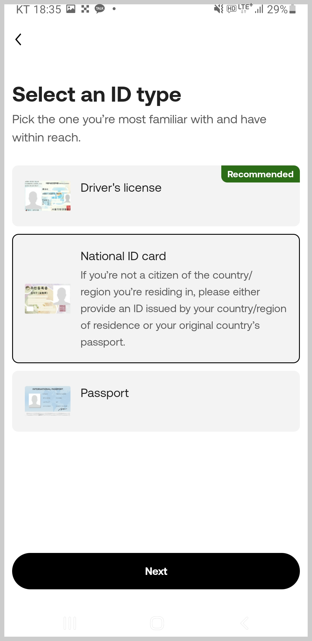 - 신분증(여권, 운전면허증 등)을 업로드하고, 얼굴 인증을 진행합니다.