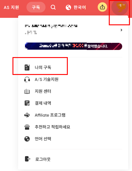 5. 결제 후, 우측 상단 이름 클릭 → 나의 구독 클릭 → Perplexity에서 이메일과 인증코드 확인 가능.