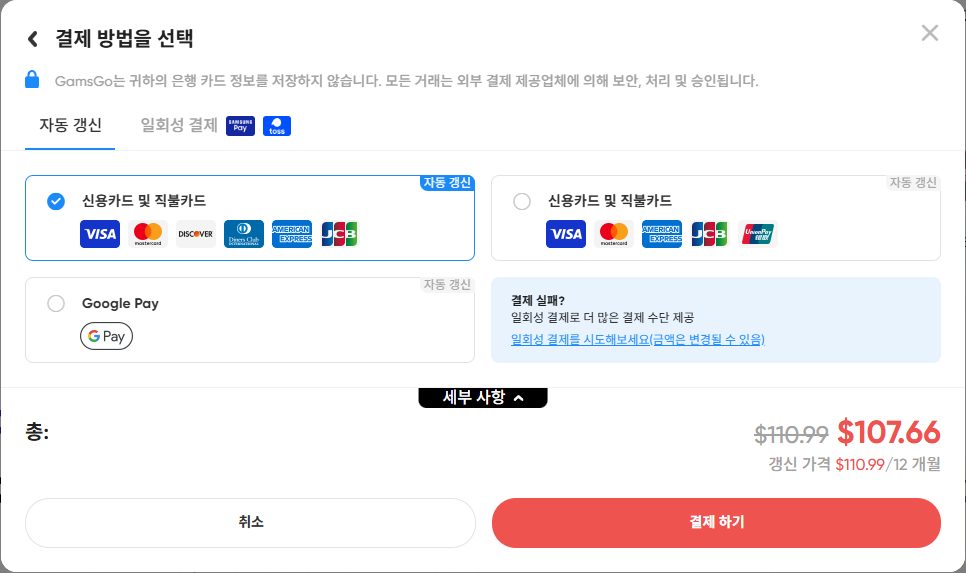 4. 결재는 신용카드, 직불카드, 구글플레이 등 가능합니다. 일회성 결재 진행 시 더 많은 결재 수단 선택 가능.