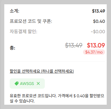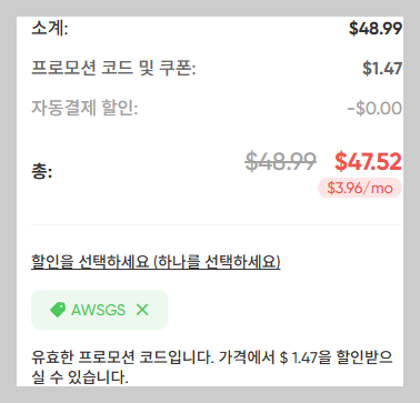 - 프로모션 코드나 쿠폰이 있나요? 클릭한 뒤 AWSGS 할인코드를 꼭 넣어주세요. 추가 할인을 받을 수 있어요.