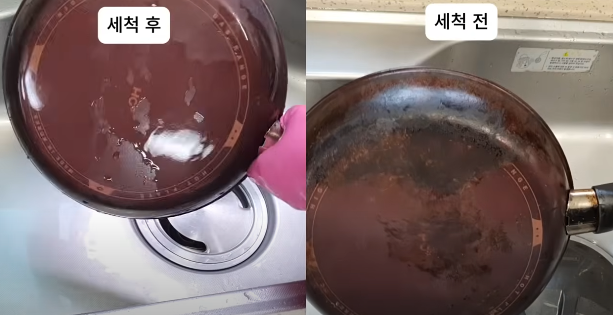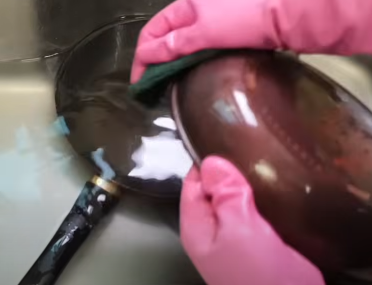 기름때가 얇으면 가볍게 문질러도 금방 닦여요. 두꺼우면 조금 더 시간이 걸리지만 벗겨진 뒤엔 정말 새것처럼 깔끔해집니다. 마지막엔 중성세제로 잔여 베이킹 소다까지 깨끗하게 씻어주면 끝! 검게 탄 냄비나 스테인리스 팬에도 같은 방법으로 활용해보세요.