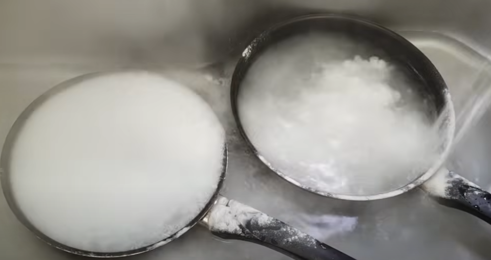 이제 베이킹 소다를 넉넉히 뿌려줍니다. 녹지 않은 가루는 살살 저어주면 금방 풀려요. 이때 창문 열고 환기 꼭 해주세요!