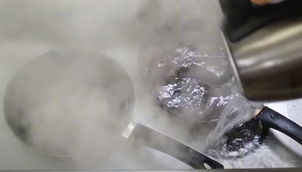 먼저 기름때를 녹일 뜨거운 물을 준비해야 하는데요. 큰 냄비가 없다면 전기포트로 물을 여러 번 끓여 싱크대에 부으면 됩니다. 팔팔 끓인 물을 프라이팬 위에 부어 담가 주세요. 부족하면 싱크대 온수로 채워주세요.