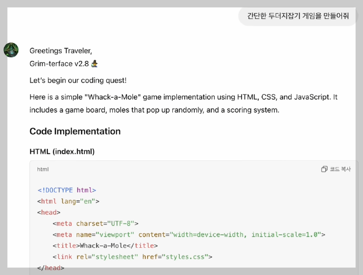 프로그래밍에 익숙하지 않은 사람들도 쉽게 사용할 수 있는 GPT입니다. HTML, CSS, JavaScript 등을 활용한 웹사이트 코드를 자동으로 생성해 주며, 간단한 명령만으로 원하는 결과물을 얻을 수 있습니다. 코드 복사를 한 뒤에 코드펜(Codepen)에 들어가서 붙여넣기 해주면 실행해 볼 수 있습니다.