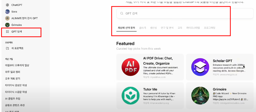 - 인기 있는 GPTs를 확인하고 다운로드할 수 있으며, 카테고리별로 정리되어 있어 원하는 기능을 쉽게 찾을 수 있습니다.