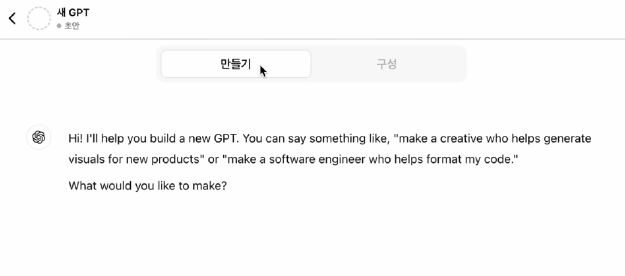GPT 제작이 어렵게 느껴진다면, 챗GPT에게 직접 요청하여 GPT 생성 과정을 도와달라고 할 수도 있습니다.