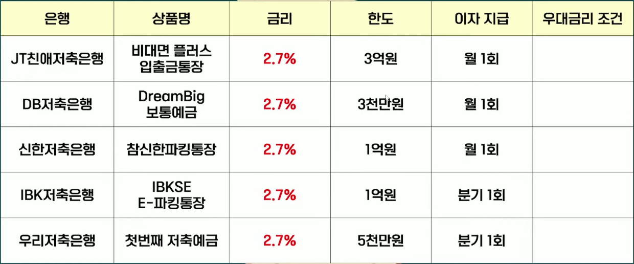 - JT친애저축은행, DB저축은행, 신한저축은행: 2.7%, 매월 이자 지급