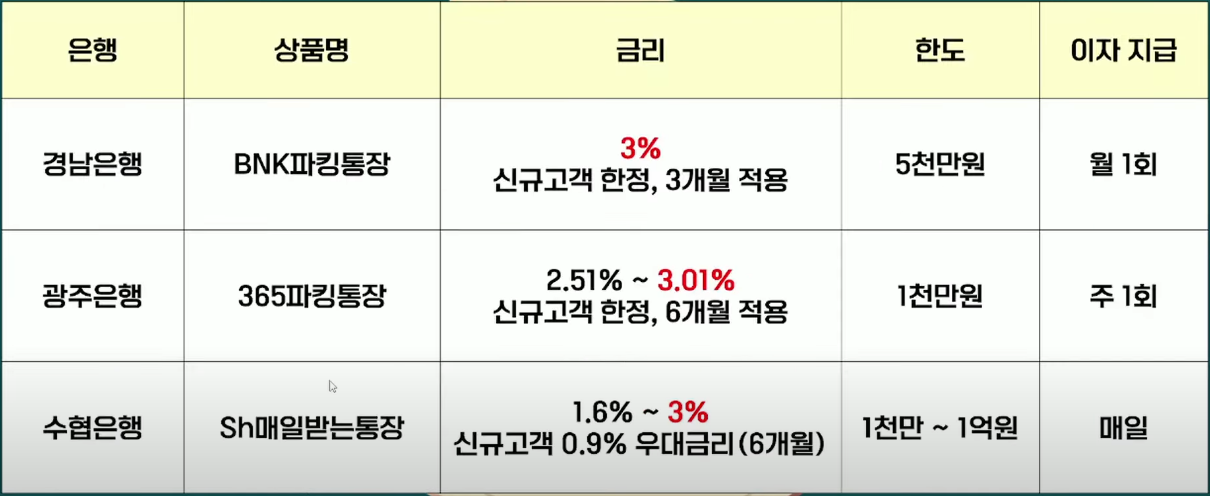 현재 1금융권에서는 3% 이상 금리를 주는 파킹통장이 딱 3개 남아 있습니다. 모두 신규 고객 한정으로 제공되기 때문에, 기존 거래가 없는 분들에게 유리해요.